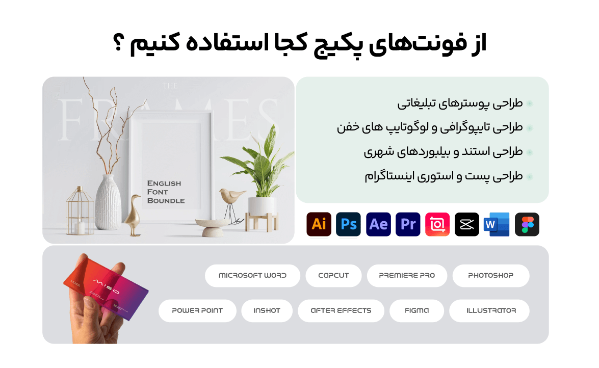 { شما میتونید در تمام اپ هایی که امکان اضافه کردن فونت دارند، از فونت های پکیج غول فونت انگلیسی استفاده کنید و هیچ محدودیتی در این باره وجود ندارد }