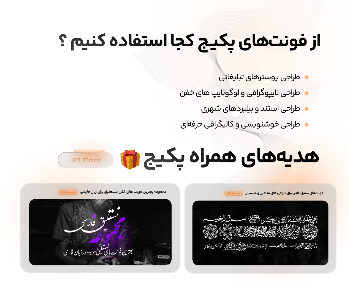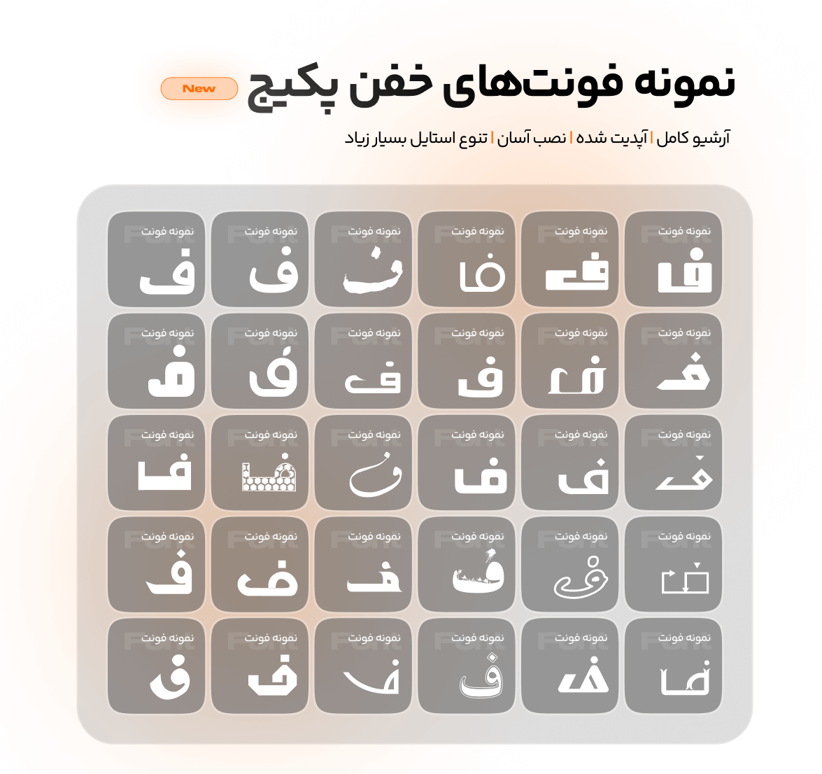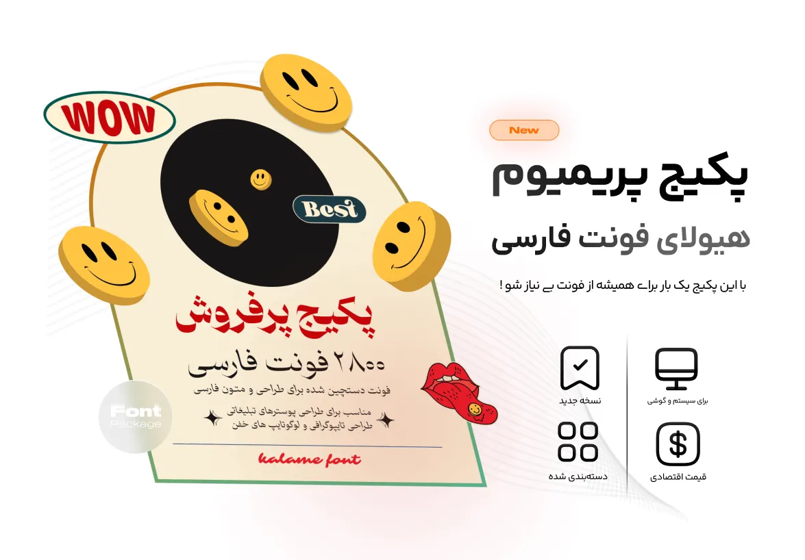 پس از ارائه کامل ترین مجموعه فونت های انگلیسی این بار قصد داریم یک مجموعه بی نظیر و بسیار کامل از فونت های فارسی را که شامل بیش از 3000 فونت هستند ارائه نماییم. پکیج هیولای فونت فارسی مجموعهای که شامل تمامی فونتهای کاربردی و مناسب برای گرافیستها میباشد. این مجموعه در نرمافزارهایی که قابلیت تایپ مستقیم را دارند مثل مجموعهی آفیس و نرمافزارهای گرافیکی مثل فتوشاپ، ایلاستریتور قابل استفاده است. مجموعه پکیج هیولای فونت فارسی با فرمت ttf/otf برای پروژه های تجاری و تبلیغاتی می تواند مورد استفاده قرار گیرد.